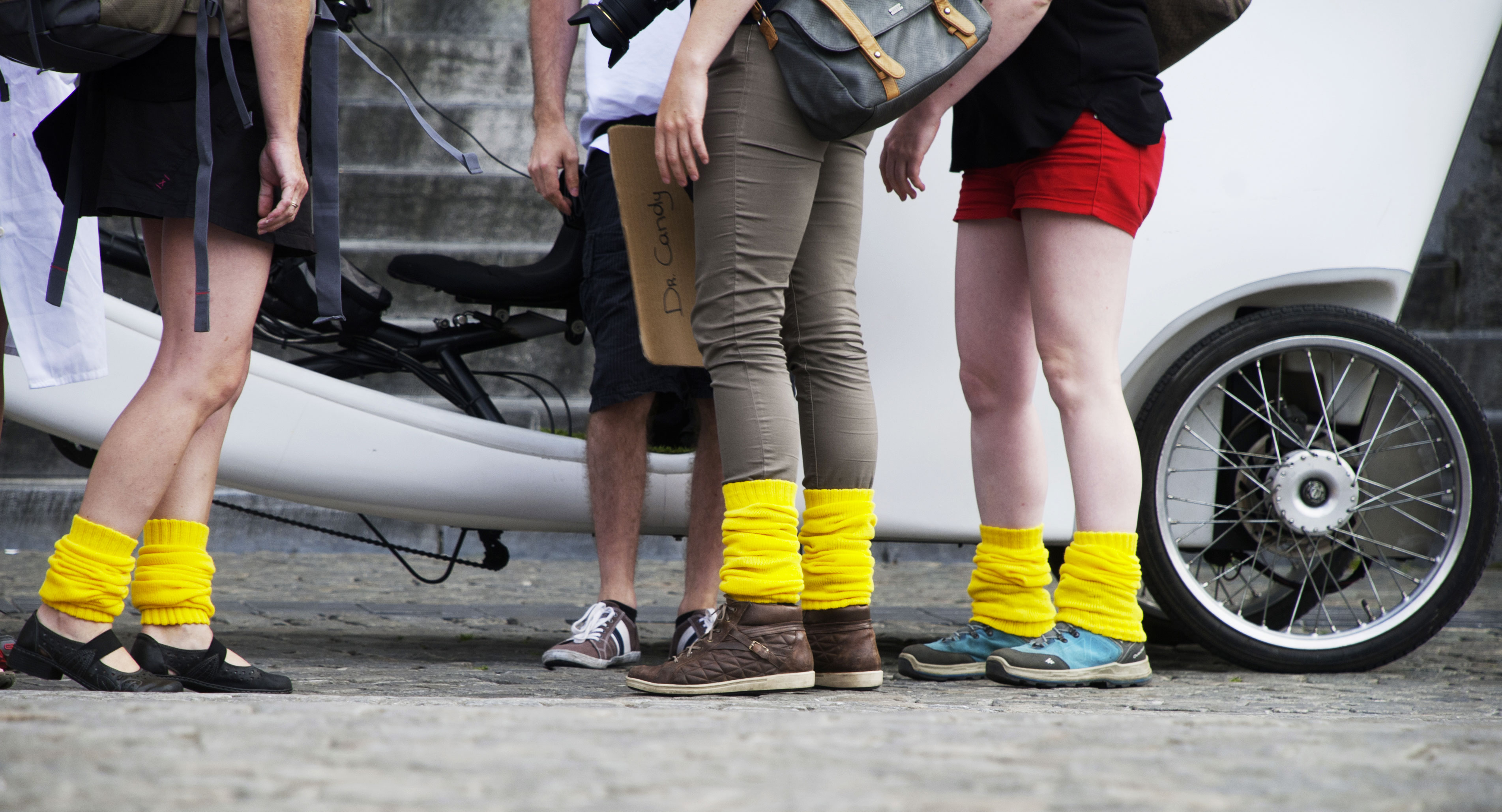 The guys were waiting for a bachelor party and all of them were wearing yellow socks except one